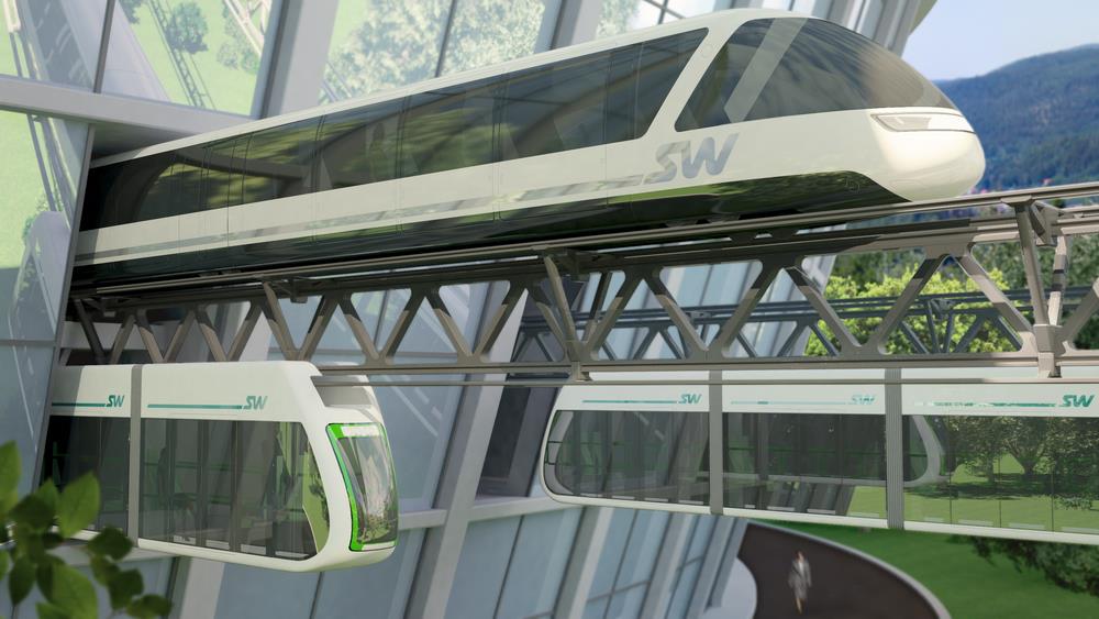 SkyWay (разработкой занимается ЗАО «Струнные технологии» в г. Минск) – надземная транспортная система, в которой движение организовано при помощи подвесных, предварительно напряжённых растяжением неразрезных струнных рельсов, натянутых между опорами. Внутри путевой структуры находится размещенный с провесом внутри пустотелого рельса пучок напряженных струн, сделанных из высококачественной стальной проволоки. После фиксации струн полость рельса заполняется твердеющей массой на основе цемента. Головка рельса (по которой и будет двигаться юнибус – колёсное транспортное средство) остается идеально ровной, поэтому не имеет неровностей и стыков по всей своей длине. Струны вместе с рельсами жёстко крепятся на анкерных опорах, размещённых в среднем через каждые 3 километра, и поддерживаются промежуточными опорами, установленными в среднем через каждые 50 метров. Струнный рельс характеризуется высокой прочностью, жёсткостью, ровностью, технологичностью изготовления и монтажа, низкой материалоёмкостью и широким диапазоном рабочих температур.