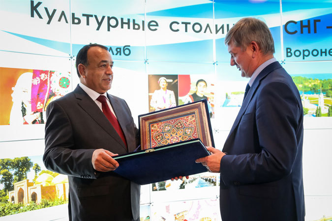 Перед началом мероприятия делегации ознакомились с экспозицией выставки, которая рассказывала о работе форума в прошлые годы, представляла российский Воронеж и таджикский Куляб в качестве культурных столиц СНГ будущего года.