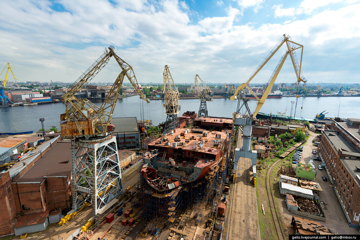 16. Стапель «А» Балтийского завода длиной 350 метров — самый большой в России. Он позволяет предприятию строить и спускать на воду суда дедвейтом до 100000 т. В разное время с этого стапеля сходили такие заказы как крейсер «Киров», атомный ледокол «50 лет Победы», тяжелые атомные ракетные крейсеры «Адмирал Ушаков», «Адмирал Лазарев», «Адмирал Нахимов» и «Петр Великий», научно-исследовательское судно «Космонавт Юрий Гагарин», а также две кормовые части «Мистраля».