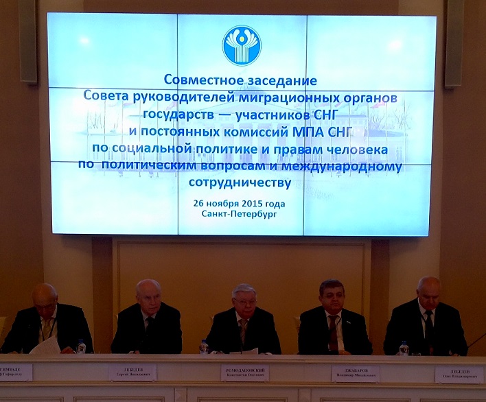 26 ноября в Санкт-Петербурге состоялось совместное заседание Совета руководителей миграционных органов государств – участников Содружества Независимых Государств и постоянных комиссий Межпарламентской ассамблеи СНГ по социальной политике и правам человека, а также по политическим вопросам и международному сотрудничеству. С приветственным словом к участникам заседания обратился Председатель Исполнительного комитета – Исполнительный секретарь СНГ Сергей Лебедев.