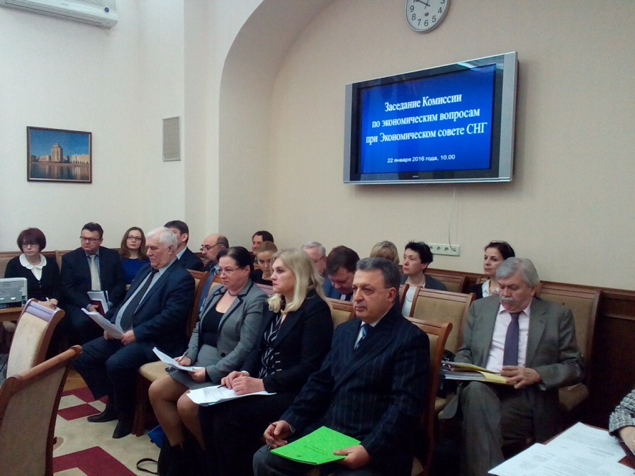 В Москве 22 января прошло первое в 2016 году заседание Комиссии по экономическим вопросам при Экономическом совете Содружества Независимых Государств, в котором приняли участие представители ряда органов отраслевого сотрудничества СНГ, органов государственного управления и учебных заведений Российской Федерации, Всеобщей конфедерации профсоюзов, заместитель Председателя Исполнительного комитета – Исполнительного секретаря СНГ Иванов С.И., ответственные сотрудники Исполкома СНГ.