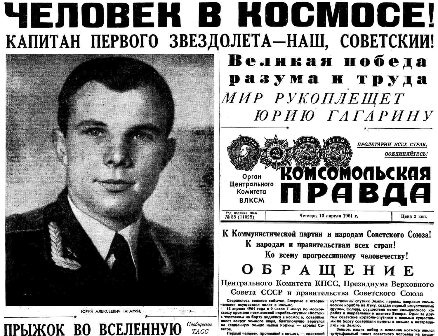 12 апреля 1961 года гражданин Советского Союза старший лейтенант Ю.А. Гагарин на космическом корабле «Восток» впервые в мире совершил орбитальный облет Земли, открыв эпоху пилотируемых космических полетов. Полет, длившийся всего 108 минут, стал мощным прорывом в освоении космоса. Имя Юрия Гагарина стало широко известно в мире, а сам первый космонавт досрочно получил звание майора и звание Героя Советского Союза.