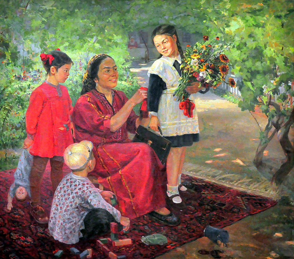 В Музее изобразительных искусств развёрнута тематическая экспозиция, приуроченная к началу нового учебного года. Её открывает известная работа народного художника Туркменистана Евгении Адамовой - «1 сентября». Евгения Михайловна представила выразительный срез внутрисемейных взаимоотношений в преддверии важного события. Преисполнена гордостью главная героиня полотна - первоклассница. От счастья светится лицо матери, рад за сестру младший брат, не сводящий с неё восхищённого взгляда. И только сестрёнка выглядит на удивление грустной: она раздосадована тем, что в школу, куда надевают красивую форму и носят портфель, полный книг, тетрадей и разных принадлежностей, идёт не она. Действие происходит во дворе, где много солнца, воздуха и зелени. Смысловая объёмность сюжета и гармоничная цветовая палитра усиливают ощущение реалистичности.
