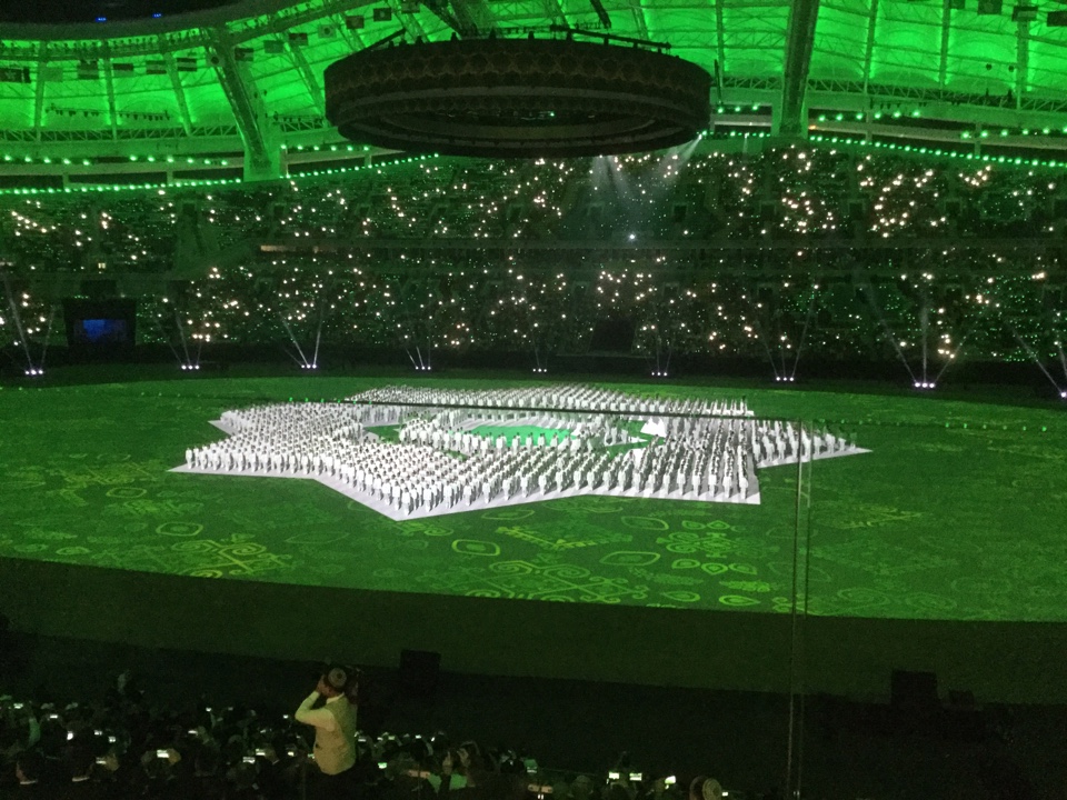 На несколько мгновений зрительские трибуны погружаются в темноту, в которой затем как в ночном небе зажглись звездочки, а на ярко освещенном поле стадиона происходит движение: с шести сторон в круг въезжают шесть всадников, за которыми шлейфами несут полотнища с надписями, символизирующими пять регионов Азиатской части континента и стран Океании.