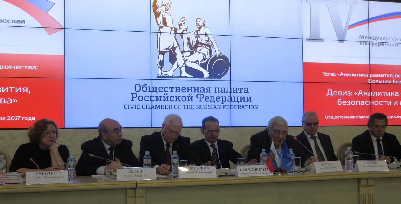 30 ноября в Общественной палате Российской Федерации состоялась IV Международная научно-практическая конференция «Большая Евразия: аналитика развития, сотрудничества и безопасности». В ней приняли участие ведущие специалисты, представители профильных российских министерств и ведомств, международных организаций, дипломатического корпуса, заинтересованные представители бизнес-структур, политических партий и общественных организаций, средств массовой информации.