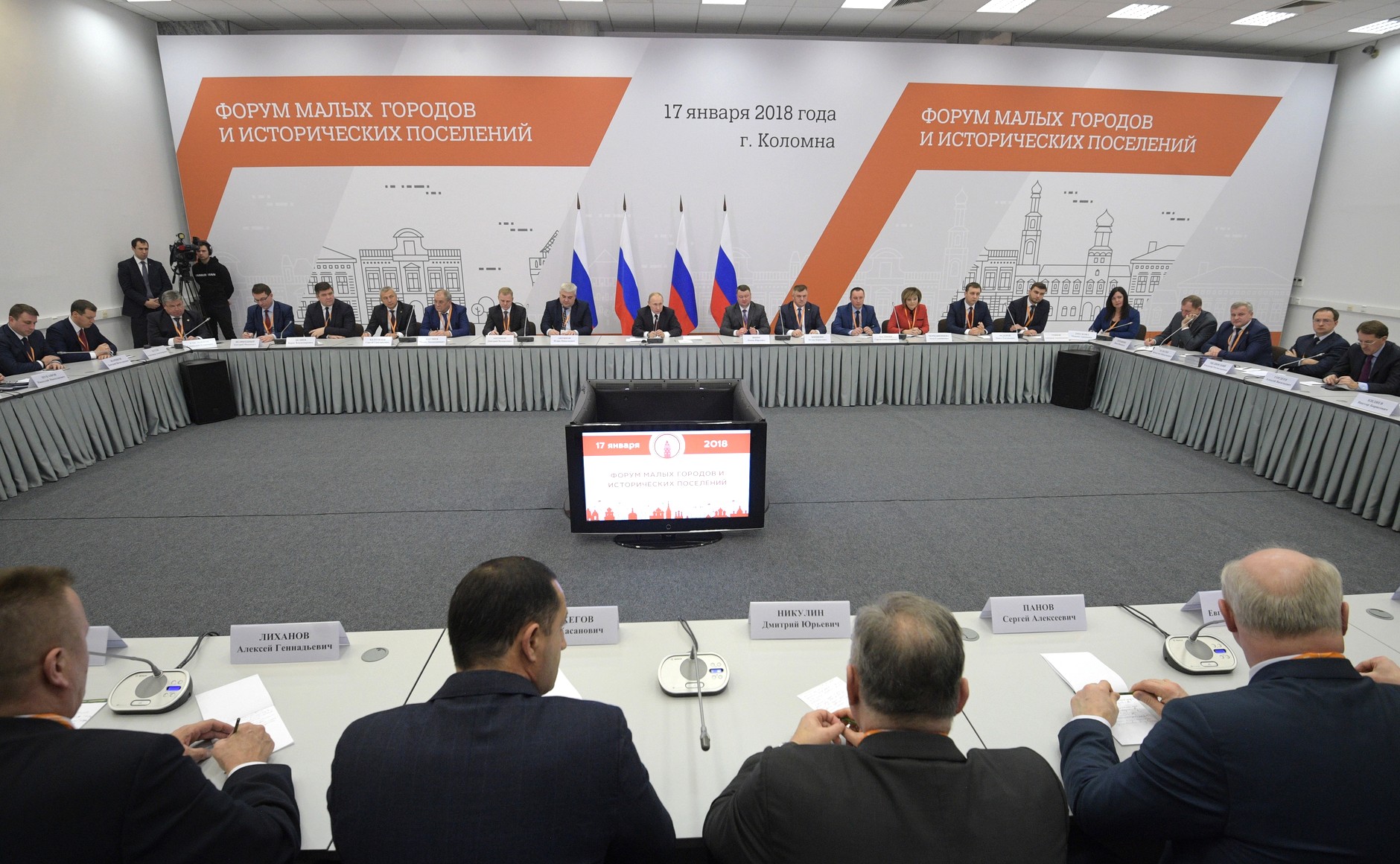Владимир Путин встретился с участниками Форума малых городов и исторических поселений, открывшегося сегодня в Коломне и посвящённого вопросам сохранения и развития культурного, туристического, экономического потенциала малых городов.