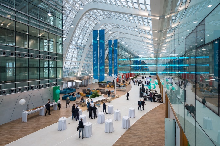 Ключевой элемент помещения бизнес-центра — широкая улица-галерея под стеклянным куполом, которая соединяет четыре офисных здания. Высота купола составляет около 20 метров, длина — 270 метров. Пешеходная зона позволит комфортно передвигаться между основными зданиями центра «Сколково» в любое время года — постоянная температура воздуха под куполом будет поддерживаться на уровне 20 градусов тепла даже зимой.