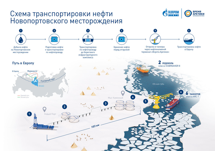 Компания «Газпром нефть» сообщила о пятнадцатом миллионе тонн нефти, извлеченном на Новопортовском месторождении на Ямале, и пятисотой партии, отгруженной с терминала «Ворота Арктики». Нефть сорта Novy Port отправлена на экспорт на танкере «Штурман Скуратов» с ледовым классом Arc7. В 2018 г. среднесуточная добыча на Новопортовском достигла 19,6 тыс. т нефти.