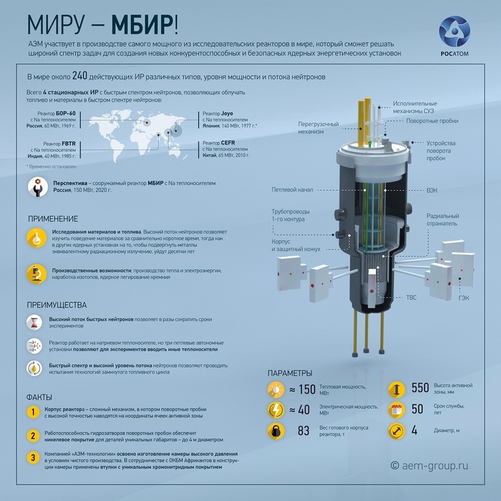 «Для нас это интересный проект, возможность найти новые эффективные решения, — отметил генеральный директор АО „АЭМ-технологии“ Игорь Котов. — Можно сказать, сегодня на нашей площадке пишется страница истории атомной энергетики. МБИР — принципиально новое изделие, и все операции, которые проводит команда „АЭМ-технологии“, осуществляются впервые».