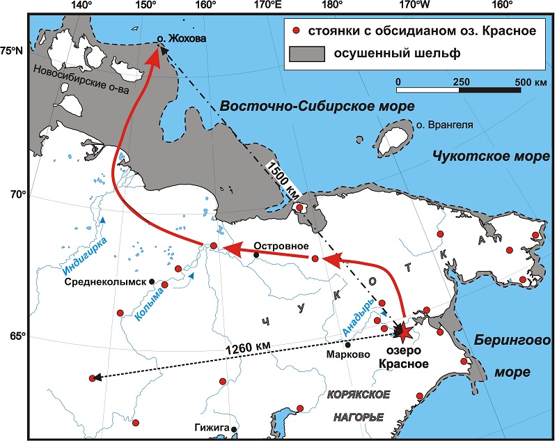На основании сравнения данных по артефактам о. Жохова с источниками обсидиана Чукотки и Камчатки надежно установлено, что именно из района озера Красное обсидиан попал на остров Жохова. Если по прямой от стоянки до Красного около 1 500 км, то реальное расстояние, которое «прошел» обсидиан, составляет не менее 2 000 км. Это уже не просто дальний, а сверхдальний транспорт сырья! Вряд ли древние люди совершали походы на столь длинные дистанции; вероятнее всего, имели место обмен или примитивная торговля обсидианом. В качестве промежуточных пунктов могли выступать стоянки в устье Колымы и, возможно, в устье Индигирки. В этом случае расстояние между точками обмена составляет около 700 км; оно вполне преодолимо ранней весной на собачьих упряжках. В качестве аналога столь дальних контактов людей в Арктике можно напомнить о существовании в XVIII—XIX веках весенней ярмарки у с. Островное на р. Малый Ануй (Западная Чукотка). Она была описана российским исследователем Севера Фердинандом фон Врангелем в 1820-х гг. На эту ярмарку съезжались русские купцы и аборигены-покупатели из огромного региона: от Среднеколымска в бассейне Колымы до Маркова на Анадырь и Гижиги на побережье Охотского моря; площадь зоны «взаимодействия» — около 1,2 млн кв. км, а дистанции между конечными пунктами — до 450—600 км. Видимо, такие «ярмарки» имели место и в далеком прошлом.