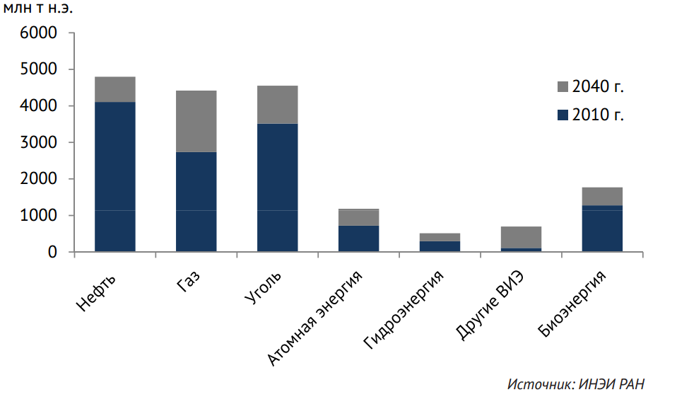 На долгосрочную перспективу сохранится доминирование ископаемых видов топлива. Доля нефти и газа в мировом потреблении первичной энергии останется практически неизменной (53,6% в 2010 г. и 51,4% к 2040г.)