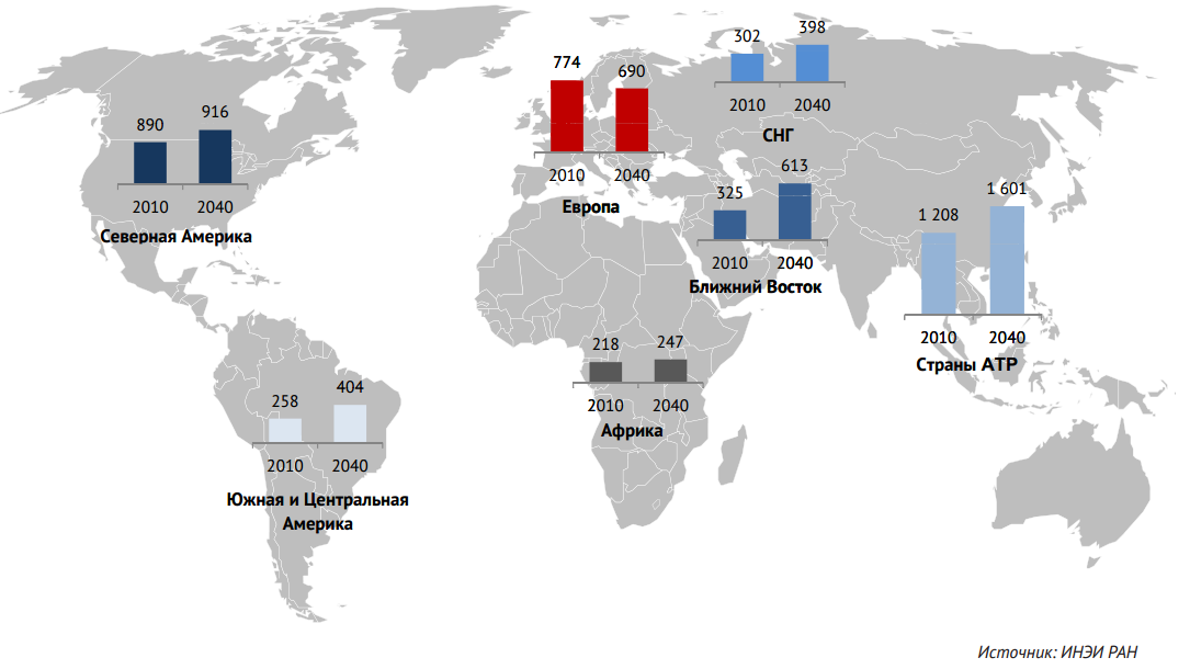 Развитие мировой торговли энергоресурсами идет на фоне растущей самообеспеченности Северной Америки благодаря нетрадиционным ресурсам нефти и газа. К 2040г. чистый импорт нефти, угля и газа в Северную Америку сменится их экспортом. Импорт энергоресурсов в Европу увеличится на 28%, основной прирост придется на природный газ. СПГ будет преобладать в межрегиональной торговле газом при наращивании объемов поставок и трубопроводного газа.